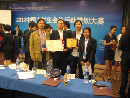 2012年3月30日,由中国国际会议产业周组委会和《中国会展》杂志社主办的2012中国大学生会议活动策划大赛决赛在厦门举行,我校经济贸易学院会展专业3名学生和1名指导老师参加了这次大赛。本次比赛有包括实力强劲的广东商学院、浙江大学、上海大学、北京第二外国语学院等院校在内的11支代表队参加了厦门的决赛。我校会展专业参赛学生不畏强手,最终获得了第七名的好成绩,李建阳、杨苑、魏欣然3名学生获得“中国大学生会议活动策划师”称号,指导老师杨军副教授获得“优秀指导教师奖”。
