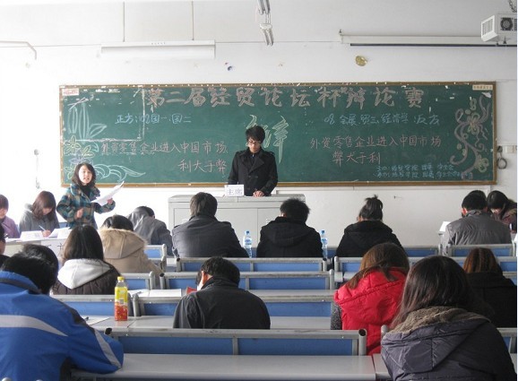 第一场比赛的烽火由正方08国一、国二与反方08会展、贸三、经济学双方点燃。继正方慷慨激昂、反方充满理性色彩的自我介绍后,比赛进入开篇立论环节,双方就“外资零售企业进入中国市场利弊权衡”阐述论点,正方以企业进入中国市场给国家、消费者带来的好处为切入点,表明己方“外资零售企业进入中国市场利大与弊”的观点,反方则认为“弊大于利”。 在随后的攻辩环节中,双方更是争锋相对、步步紧逼,现场气氛迅速升温。大赛继续进行,进入自由辩论环节。正方以家乐福为例,指出外资企业进入中国市场将给中国带来更大的机遇,并要求对方如果认为弊大于利就给出具体数据,辩手们精辟的措辞,犀利的言辞,展现出咄咄逼人的气势。反方辩手也不甘示弱,舌灿莲花,针对对方的家乐福举出沃尔玛例子,从经营方式不可轻易模仿、改革开放不是完全开放等多角度论证。双方各执一词,你来我往,却又不失风度,侃侃而谈,赢得了在场同学的阵阵喝彩。最后双方四辩通过清晰的思路和缜密的逻辑为本场比赛做了完美的总结陈词。