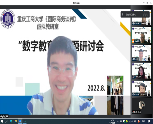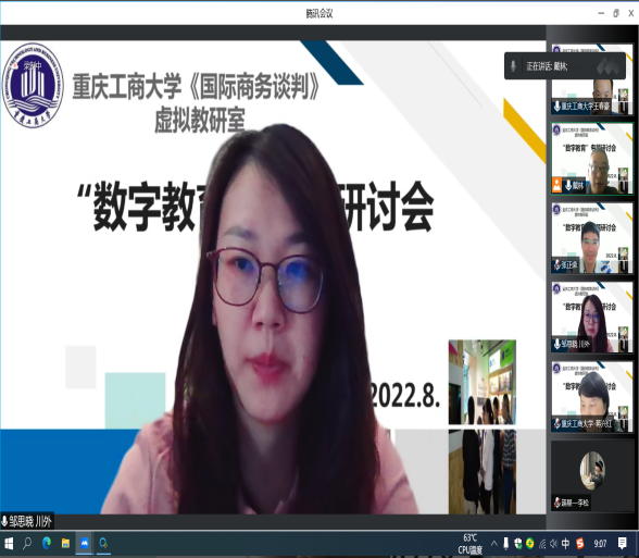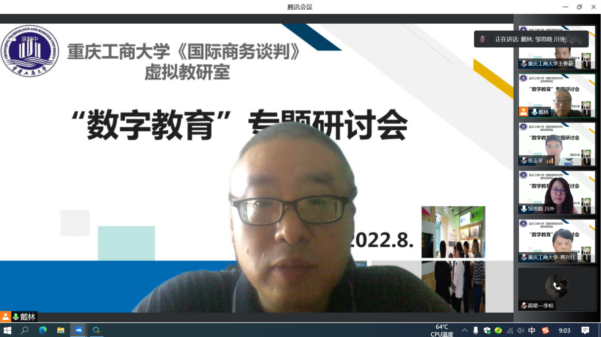 2022年8月19日,437ccm必赢国际校级虚拟教研室,《国际商务谈判》虚拟教研室“2022数字教育专题研讨会”在腾讯会议平台成功举办,会议由教研室负责人戴林副教授主持,校外成员浙江理工大学管理学院跨境电子商务研究所所长张正荣、四川外国语大学国际金融与贸易学院国际经济与贸易系主任邹思晓以及校内成员蒋兴红、王春豪、冉梨等老师参加了会议,特邀超星公司李松、张秋林和刘文静老师参加研讨。