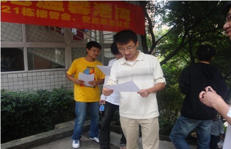 为了进一步推动“创建美丽家园”活动的深入开展,加深同学的清洁意识。10月20日上午,北21栋楼管会和党员服务站共同开展了“创建美好家园,拥抱温馨港湾”宣传活动。