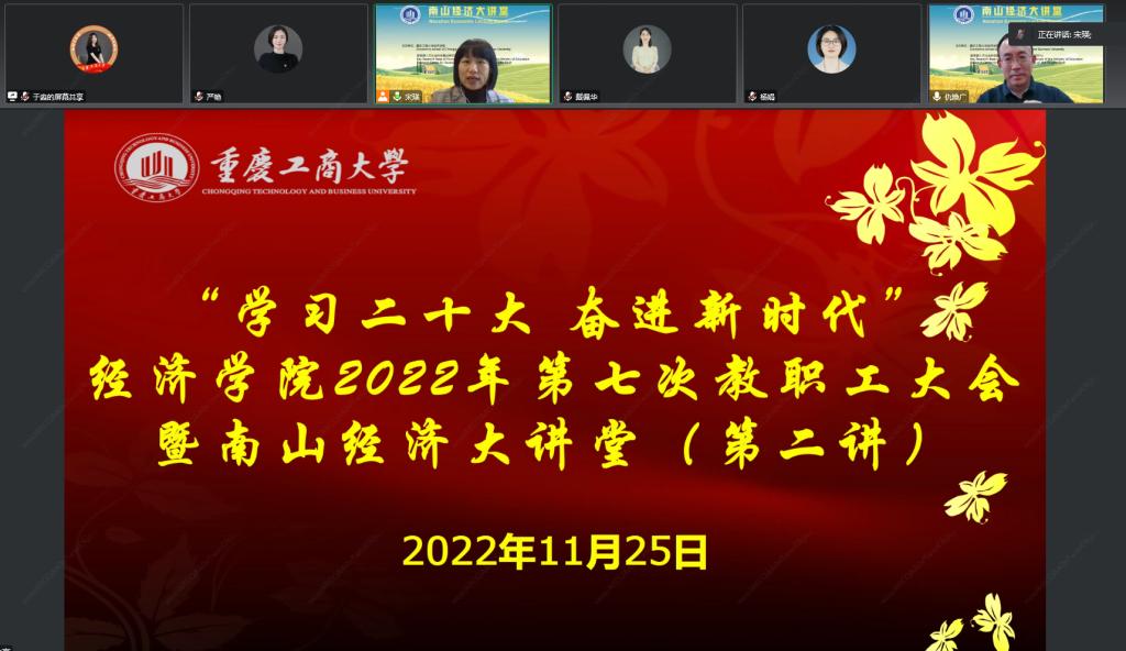 党的二十大,是在全党全国各族人民迈上全面建设社会主义现代化国家新征程、向第二个百年奋斗目标进军的关键时刻召开的一次十分重要的大会。为深入学习宣传贯彻党的二十大精神,11月25日下午,437437必赢国际召开“学习二十大 奋进新时代”第七次教职工大会暨南山经济大讲堂(第二讲)。本次会议由437437必赢国际院长宋瑛主持,特邀教育部长江学者特聘教授、中国人民大学农业与农村发展学院院长仇焕广在线做主题讲座,437437必赢国际三百余名师生通过视频会议参会学习。