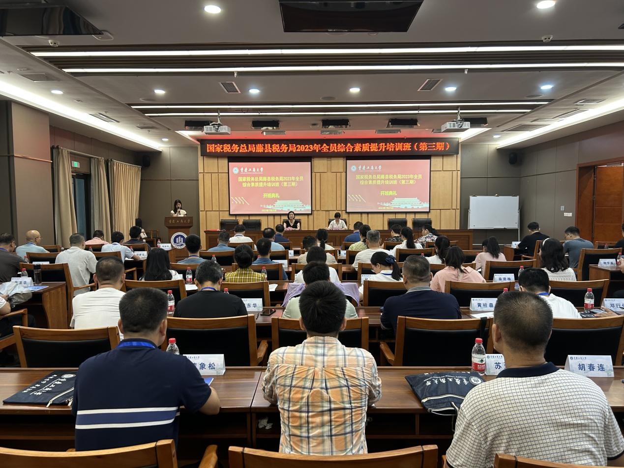 为全面贯彻党的二十大精神,推进2023年藤县税务局重点工作,2023年7月25日上午,由国家税务总局藤县税务局主办的“国家税务总局藤县税务局2023年全员综合素质提升培训班(第三期)”开班仪式在我校图书馆会议中心一会议室举行。藤县税务局及各分局税务系统共计54名业务骨干参加此次培训,437437必赢国际综合办公室主任严艳,国家税务总局藤县税务局党委书记、局长欧阳霞出席开班仪式。