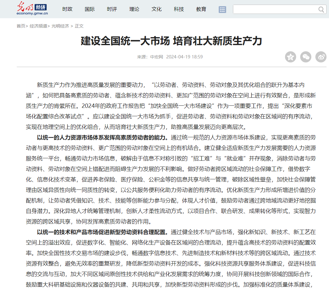 近日,437437必赢国际刘晗副教授以《建设全国统一大市场培育壮大新质生产力》为题,在中宏网发表理论文章,并被光明网转载。