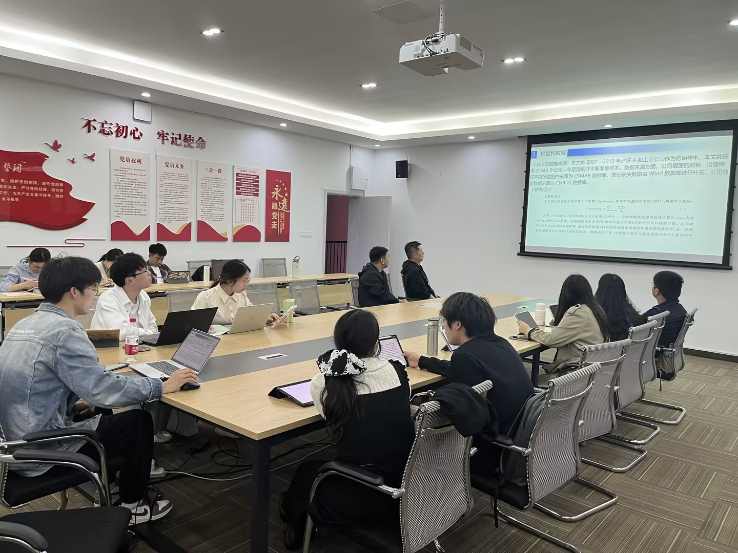 随后的学术报告环节,呈现了研究生们对经济理论与实践问题的深度思考。2021级西方经济学专业的陈祠标同学围绕“城市群人口集聚对域内企业创新的促进作用”进行了系统阐述,其研究视角新颖,分析透彻。2022级产业经济学专业的覃龙静同学则探讨了“数字经济发展在促进农民工高质量就业方面的机制与挑战”,尤其针对“数字鸿沟”引发的讨论,为解决农民工就业问题提供了新视角。紧接着,付俊治同学分享的“企业数字化转型背景下供应链策略选择的实证研究”,展示了严谨的实证分析方法,为在场师生提供了宝贵的研究范例。