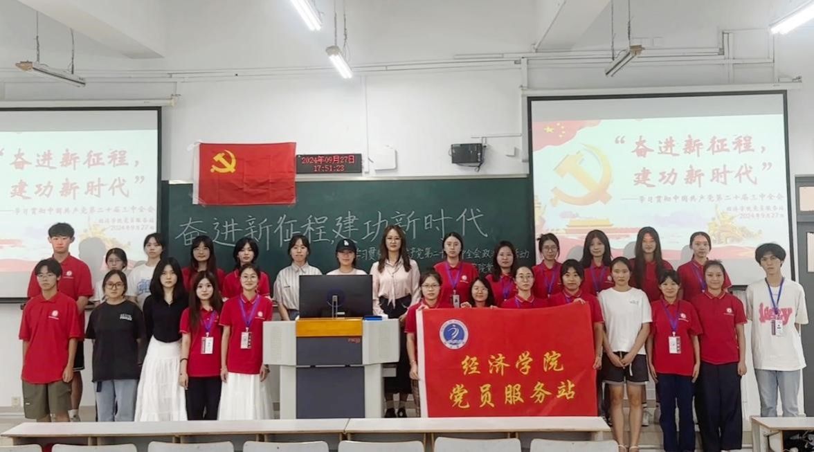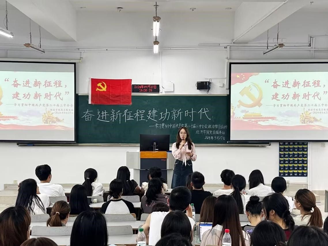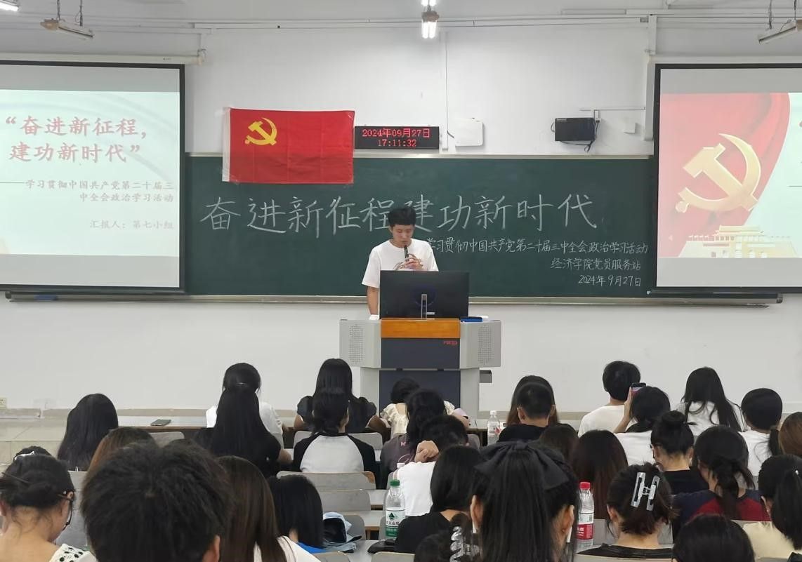 党的二十届三中全会是在以中国式现代化全面推进强国建设、民族复兴伟业的关键时期举行的一次十分重要的会议。为深入学习贯彻党的二十届三中全会精神,加强经济学子思想政治建设,437437必赢国际党员服务站于2024年9月27日在博智楼07308成功举办“奋进新征程,建功新时代”——学习贯彻党的二十届三中全会精神政治学习活动。本次活动共80余人参加,22国贸二班康欣同学担任主持。