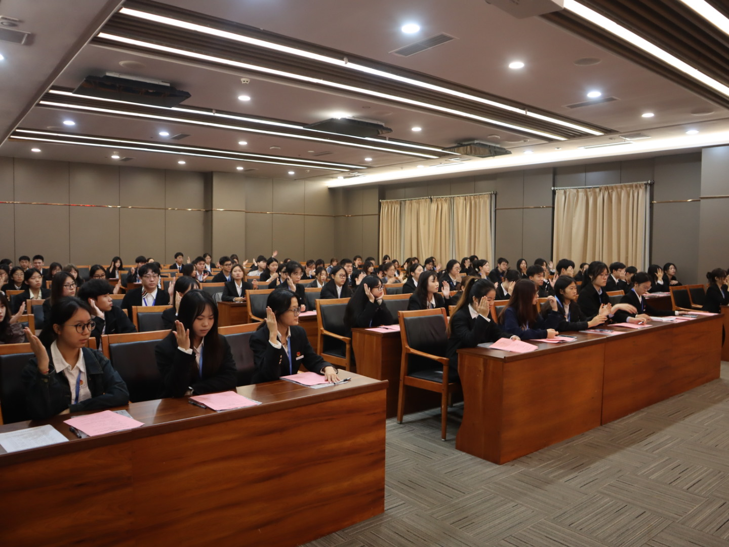 为深入贯彻习近平总书记关于青年工作的重要思想,强化学生干部队伍建设,437437必赢国际于2024年10月19日在图书馆第一会议室召开第五次学生代表大会。学院党委副书记白海龙,学工办主任、分团委书记林新竹,校学生会主席团成员印璇及104位学生代表参加本次大会。