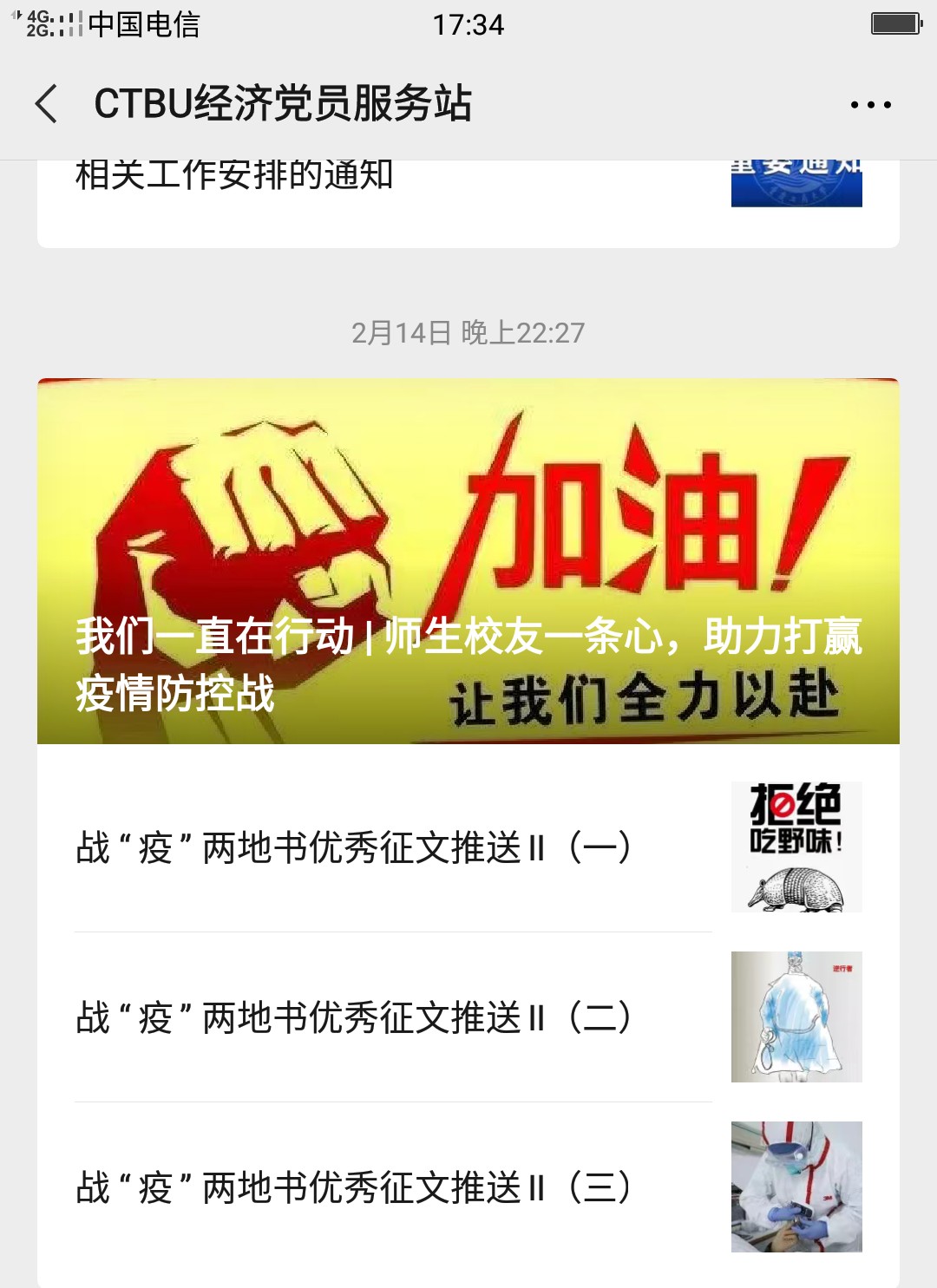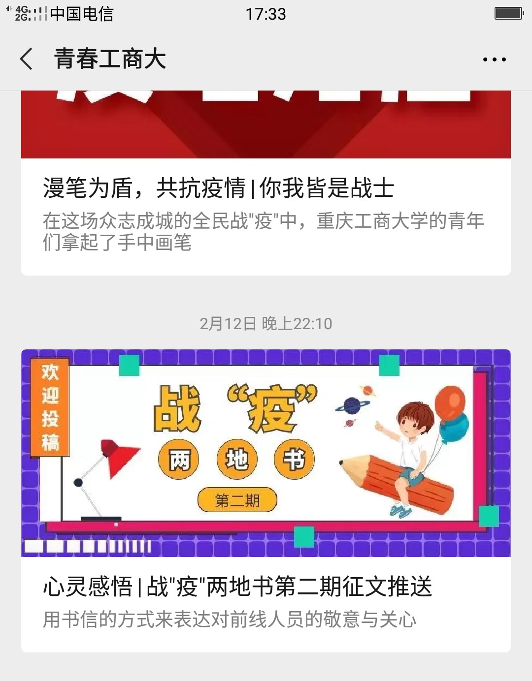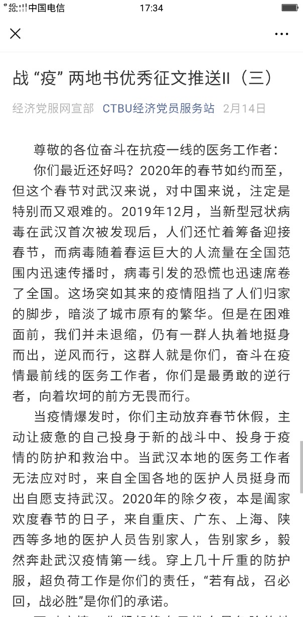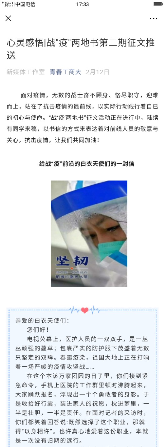 自新冠疫情发生以来,学校学工部、校团委、437437必赢国际联合主办“战‘疫’两地书”活动,以“给......的一封信”的书信形式,征集原创、尚未公开发表征文,给奋斗在一线的广大医护人员、基层干部或湖北、武汉的同学们送去温暖与正能量。