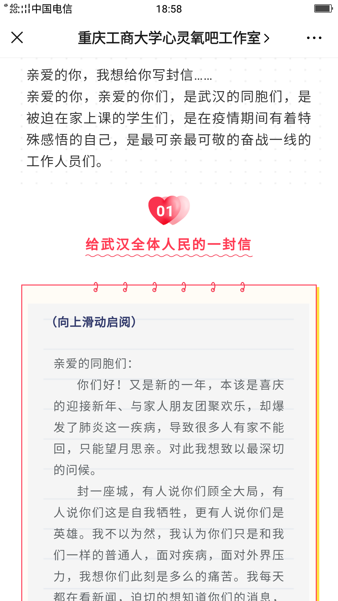 《给“白衣战士”的一封信》、《给钟南山院士的一封信》、《给武汉同胞们的一封信》、《给新冠病毒的一封信》......这一封封的信件寄托着437ccm必赢国际学生的敬佩、关心、希冀、牵挂,让艰难的日子充满温情,让战“疫”充满必胜的信心。