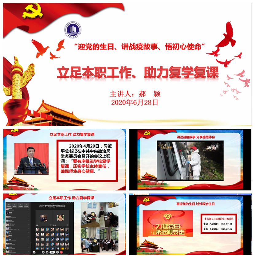 首先,支部书记郝颖同志讲党课——“立足本职工作,助力复学复课”。她讲到,中国战“疫”积累起来的经验做法总结起来就是“战‘疫’中国策九字诀”。同时,她分享了疫情防控期间为了助力复学复课,437437必赢国际学工队伍每天关注学生动态和健康数据上报,做好学生复课的各项服务工作,自己也临危受命从2020年1月28日起组织心理氧吧工作室成员开通线上心理咨询,服务了135位同学,及时干预3起严重心理危机;437437必赢国际办公室也积极加强教师线上办公技能培训,为师生线上教学服务等。