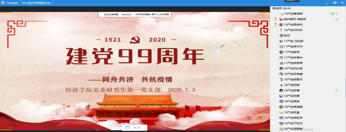 7月3日下午15点,437437必赢国际党委研究生第一党支部在线上成功举办以“同舟共济、共抗疫情”主题的抗“疫”故事分享会。本次大会由组织委员饶晓萍主持,研究生第一支部全体党员参加此次活动。此次活动旨在持续加强支部建设,切实发挥党组织优势,教育引导师生党员进一步担当起来,坚定信心、经受考验,发挥党员先锋模范作用。大会进行,由黄旭婷同志分享437437必赢国际分党委研究生第一支部的党员同志的抗“疫”故事。
