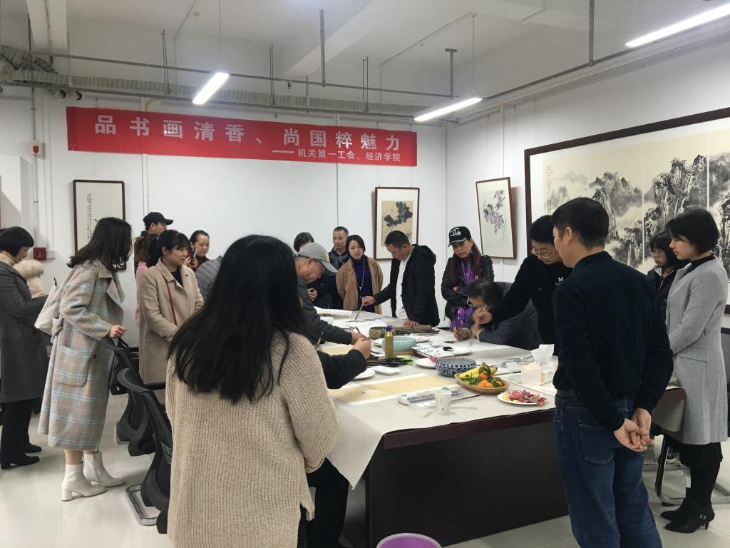 11月22日下午,437437必赢国际工会和机关(1)工会在商智楼(原图书馆)3003室举办了第二届“品书画清香,尚国粹魅力”书画艺术鉴赏会,校图书馆馆长郭楠、437437必赢国际分党委副书记于频及两个部门工会80余名会员参加了鉴赏会。本次活动有幸邀请到了曾令富、谢纯洁、曾德智、张毅、何国胜、邓剑宾等6名重庆市知名书画家,艺术家们为老师们做了书画创作和品鉴知识交流,现场表演了精彩的国画作品创作,并对爱好书画的老师们的书画作品进行了品鉴和专业的指导。郭楠馆长主持了活动并现场挥墨作画。最后,画家们将他们创作的画作赠送给了在场的书画爱好者,并与大家合影留念。