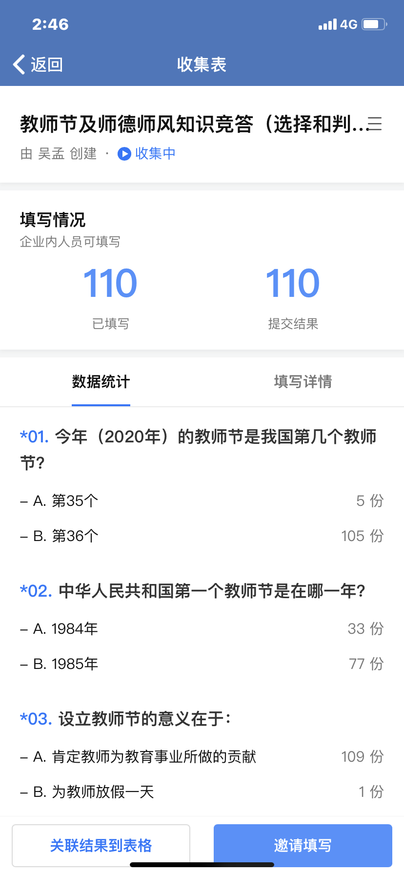 在第36个教师节来临之际,为营造节日氛围,增强广大教师的荣誉感、责任感和使命感,铭记师德师风在教育教学中的重要性,激发教师们更好地教书育人,437437必赢国际工会精心策划组织了全院教职工参与的“教师节及师德师风知识竞答活动”。为解决疫情期间尽量不大规模聚集的问题,本次知识竞答活动采取了线上答题的方式,知识竞答题包含了有关教师节的历史、教师节的意义、教师法对教师使命的规定、教师职业的本质及内在要求、习近平总书记关于师德师风的重要讲话精神,等等。通过教师节和师德师风知识的答题,老师们重温和再次感受了党和国家以及全社会给予教师的崇高荣誉和光荣使命,纷纷表示要珍惜这个荣誉,为人师表,教师育人,为国家为社会培养德智体美全面发展的合格人才。