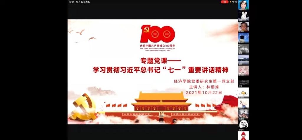 10月22日,437437必赢国际党委研究生第一党支部在线上召开了以“学习贯彻习近平总书记‘七一’重要讲话精神”为主题的专题党课学习活动。此次党课由支部书记林细妹主讲,支部全体成员参加。