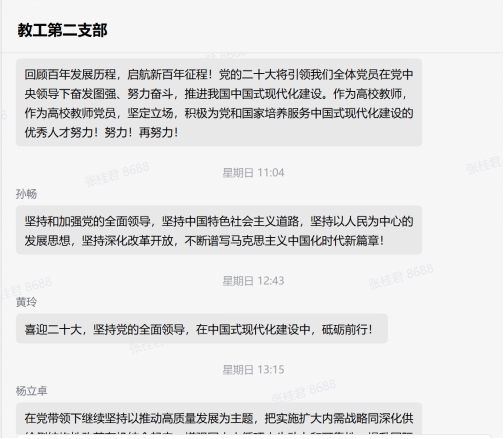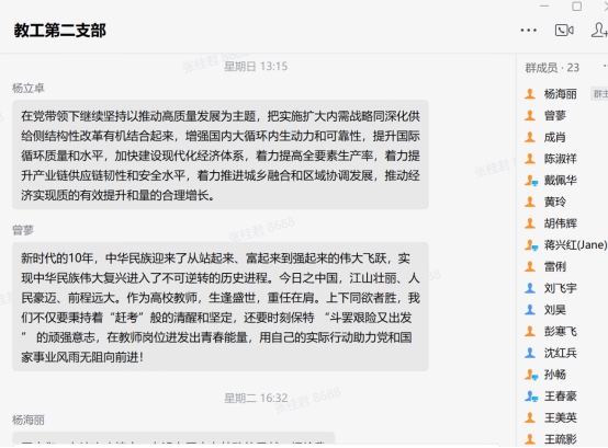 习近平总书记的报告高瞻远瞩,思想深刻,内涵丰富,振奋人心,让老师们倍受鼓舞。在观看过程中,支部成员们直抒胸臆:“党的二十大,振奋人心,催人奋进。中国共产党始终是一个有崇高理想和坚定信念的党。一代代中国共产党人拼搏奉献、攻坚克难,靠的就是一种信仰,为的就是一个理想。作为高校教师,坚持用心用情讲好思政课,引导青年学生听党话、跟党走。”“党的十八大以来,党和国家事业发展经历了极不寻常、极不平凡的十年。以习近平同志为核心的党中央始终把握历史大势、掌握历史主动、保持战略定力,凝聚起全国各族人民的奋进伟力,引领中国克服重重困难,不断创造奇迹,朝着光明未来破浪前行。”“在党带领下继续坚持以推动高质量发展为主题,把实施扩大内需战略同深化供给侧结构性改革有机结合起来,增强国内大循环内生动力和可靠性,提升国际循环质量和水平,加快建设现代化经济体系,着力提高全要素生产率,着力提升产业链供应链韧性和安全水平,着力推进城乡融合和区域协调发展,推动经济实现质的有效提升和量的合理增长。”