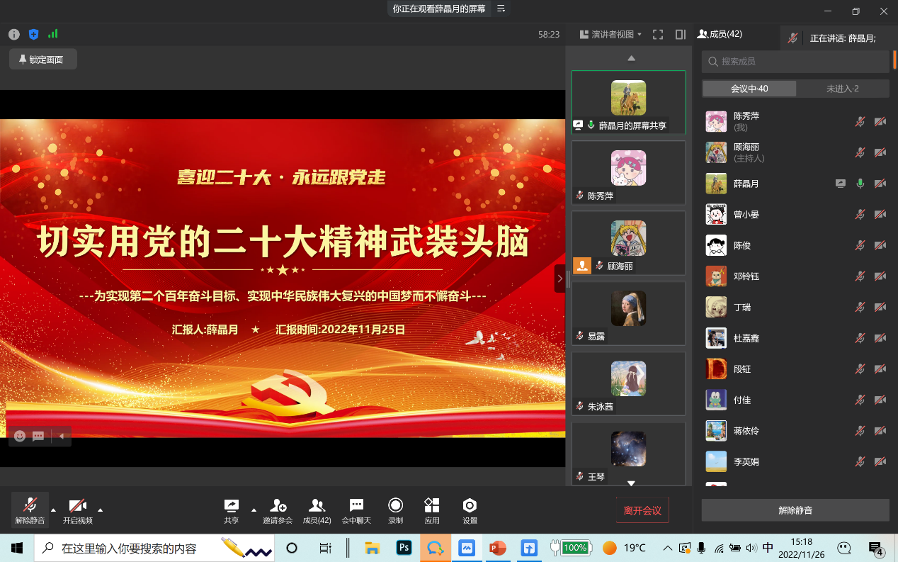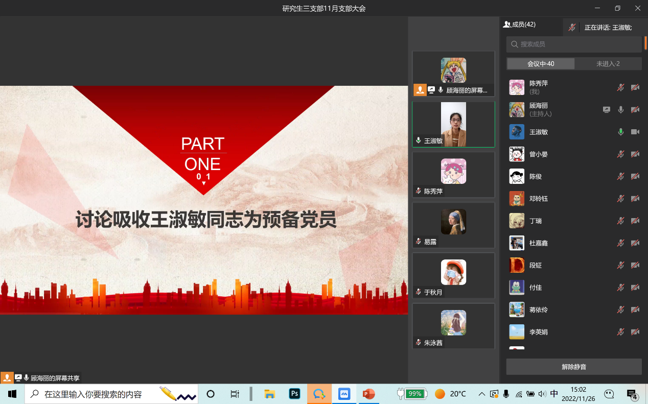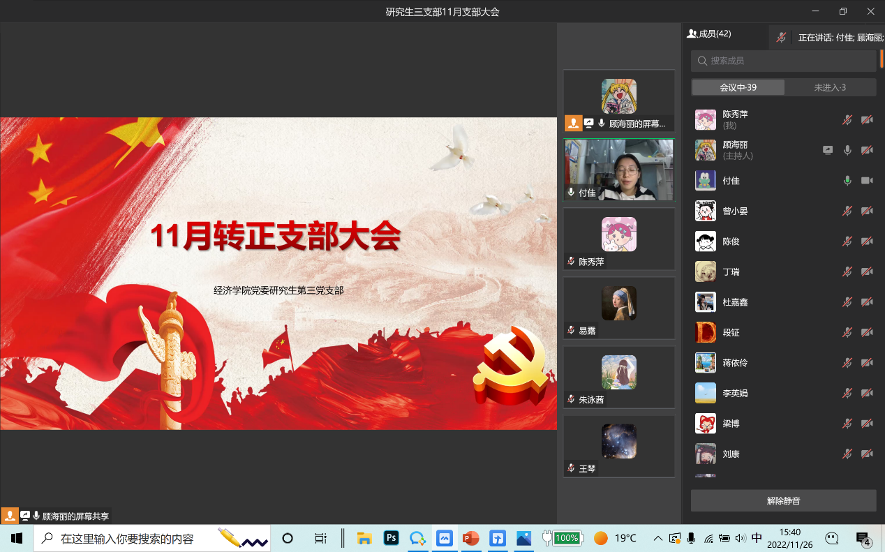 2022年11月26日,437437必赢国际研究生第三党支部通过企业微信线上会议召开了11月支部大会,会议内容包括支部书记讲党课事宜、预备党员转正以及讨论接收预备党员事宜。本次会议由支部书记薛晶月主持,研究生三支部全体党员参加。