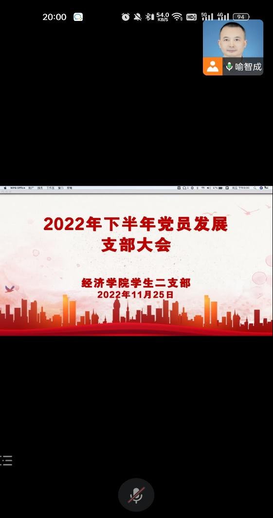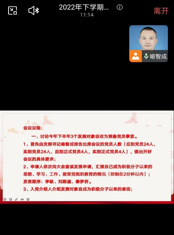 2022年11月25日,437437必赢国际党委学生二支部在企业微信线上开展了2022年下半年党员发展支部大会,参与活动的有二支部全体正式党员、预备党员、入党介绍人,活动由支部书记喻智成老师主持。