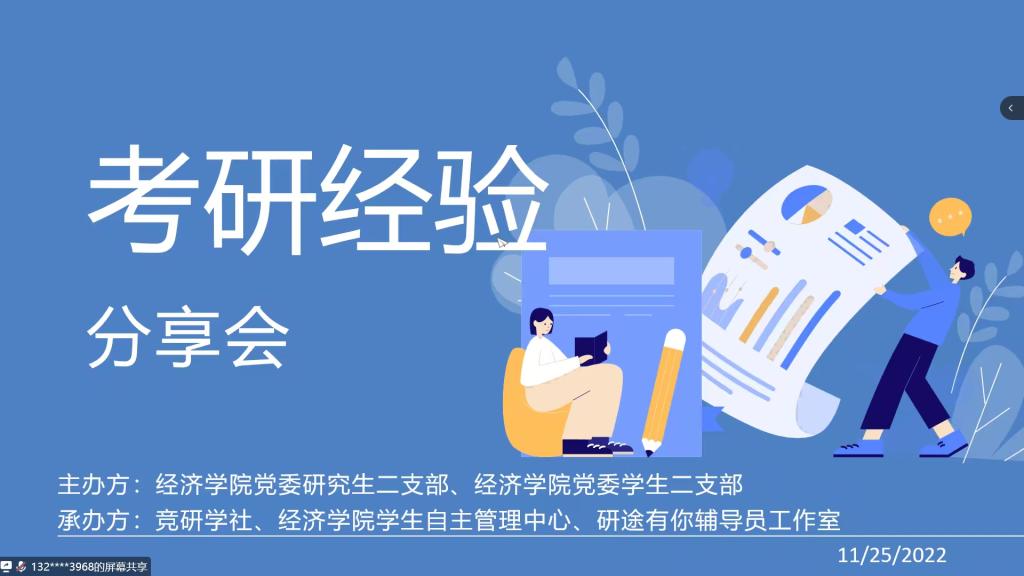 面对当今社会的激烈竞争,大学生就业难度不断加大,考研成为越来越多大学生的选择。为了帮助同学们增强对考研的认识,进一步明确考研方向,2022年11月25日,由437437必赢国际党委研究生二支部和学生二支部主办,贸易经济竞研学社承办的考研经验交流分享会在线上如期举行。此次分享会邀请到我院研究生二支部王洁仪,王伟婷,章燕玲和蔡小西四位研究生学姐与大家分享她们成功上岸的经验,为大家点亮考研之路的明灯。学院党委雷菁组织员、研究生二支部书记高娟老师、学生二支部书记喻智成老师和两个支部全体党员和贸经专业150余人参加本次分享会。