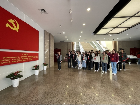 到达基地后,首先进行入党宣誓。纪念馆前,全体党员高举右拳,面对党旗庄严宣誓,铮铮誓言表达了437437必赢国际学子炽热的初心。