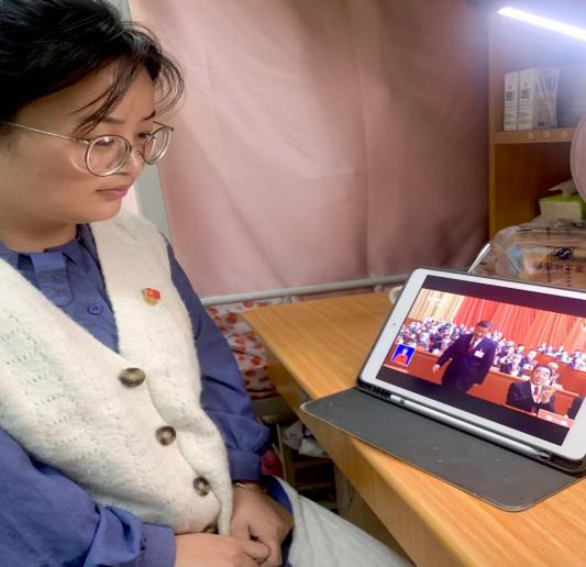 研究生四支部全体党员在收听收看大会开幕会后倍感振奋,纷纷表示要更加紧密地团结在以习近平同志为核心的党中央周围,高举中国特色社会主义伟大旗帜,全面贯彻习近平新时代中国特色社会主义思想,弘扬伟大建党精神,自信自强、守正创新,踔厉奋发、勇毅前行,为全面建设社会主义现代化国家、全面推进中华民族伟大复兴而努力奋斗。
