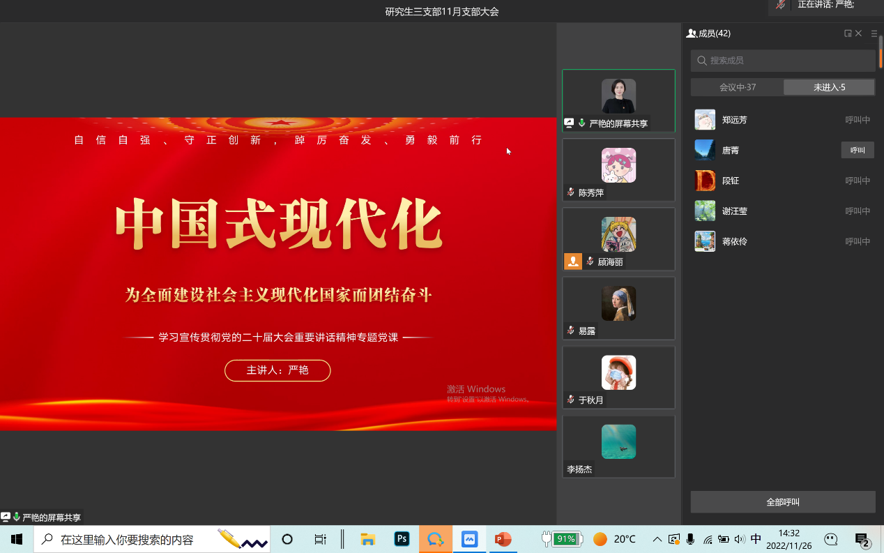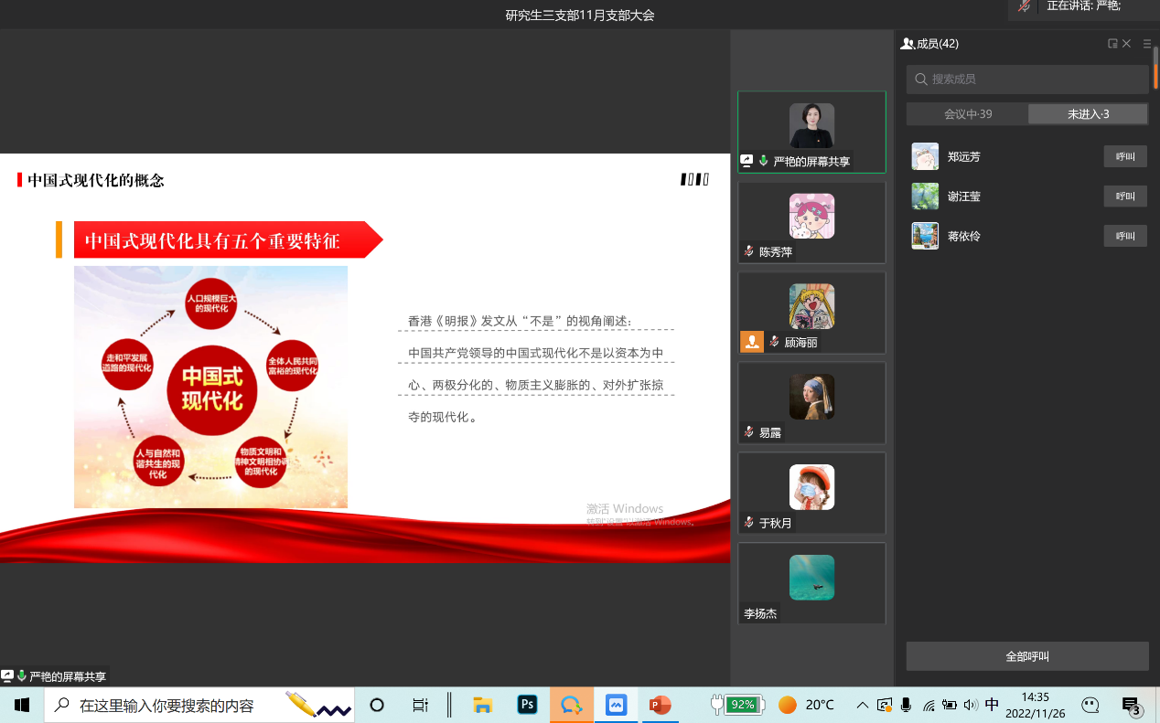 2022年11月26日,437437必赢国际研究生第三党支部通过企业微信线上会议召开了11月支部大会,会议主要内容是党委委员严艳讲党课。本次会议由支部书记薛晶月主持,研究生三支部全体党员参加。