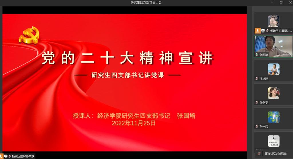 11月25日下午2点,437437必赢国际研究生四支部通过企业微信开展了支部书记讲党课活动,研究生四支部书记张国培带领支部党员同志学习党的二十大精神。本次讲党课活动由研究生四支部宣传委员杨婉玉主持,研究生四支部全体党员参加学习。