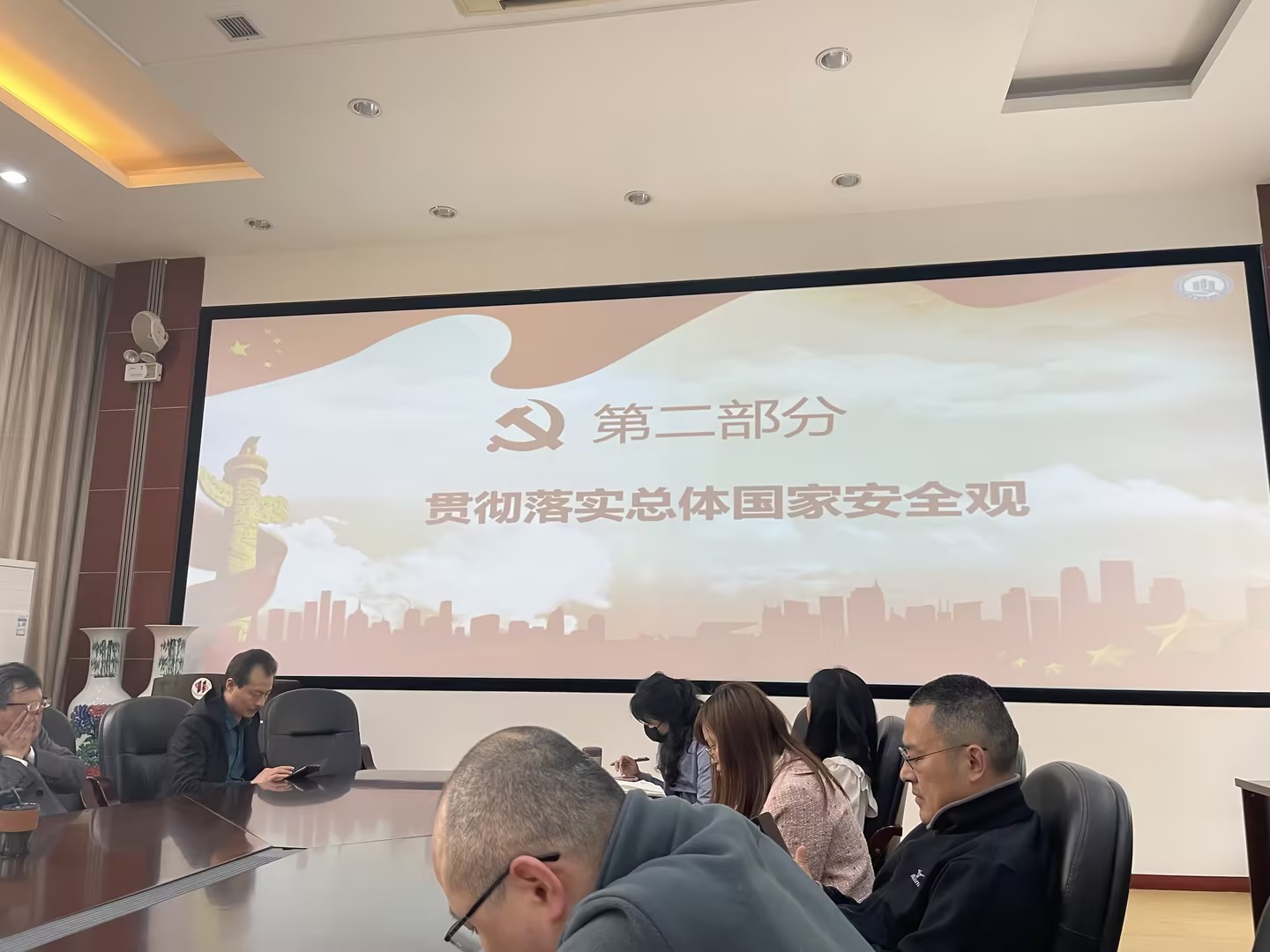 然后,支部组织委员邓雪霜领学贯彻落实总体国家安全观,自觉把思想和行动统一到党中央决策部署上来。作为高校教师党员,要严于律己,强化理论学习立德树人,践行国家安全教育。