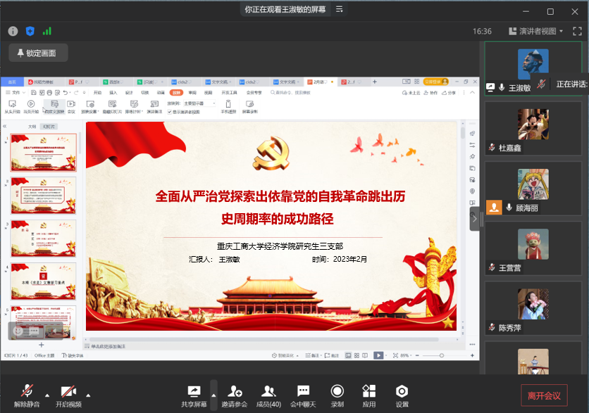 2023年2月23日下午,437437必赢国际研究生第三党支部在企业微信线上会议室开展了2月组织生活会,深入学习习近平总书记在《求是》上的文章——《全面从严治党探索出依靠党的自我革命跳出历史周期率的成功路径》。本次会议由支部委员顾海丽主持,研究生第三党支部全体党员参加。