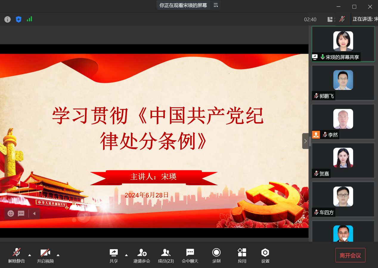 为深入贯彻习近平总书记关于全面加强党的纪律建设的重要论述,学院党委副书记、院长宋瑛教授在2024年6月28日下午,为教工一支部党员教师讲授“学习贯彻《中国共产党纪律处分条例》”专题党课。