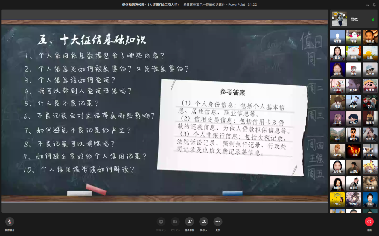 活动在中午十二点半正式开始,437437必赢国际党委副书记王燕教授为活动致辞,号召同学们认真学习、学以致用,主动保护好自己的征信,为未来的人生积攒财富。大连银行团委书记蒋蕾蕾随后发言,感谢437437必赢国际为大连银行提供宣讲平台,同时感谢学校师生的信任与支持,希望未来能够与学院和同学做更多金融知识的交流。大连银行重庆分行团委副书记易敏,通过线上直播课分享,为到场大学生们宣讲了“大学生应知应会的十个征信知识”,通过生动的案列、温馨的视频和详实的解读,让大学生们加深了对个人征信知识的了解,知道了不良记录的危害,学习了如何保护个人信用记录。