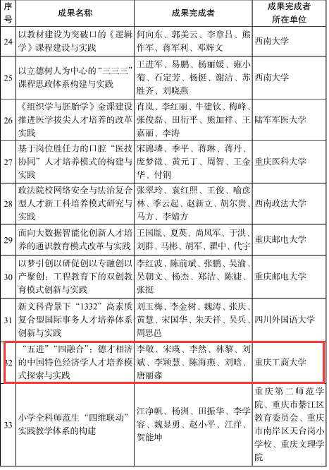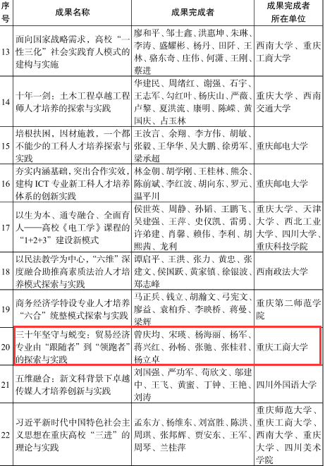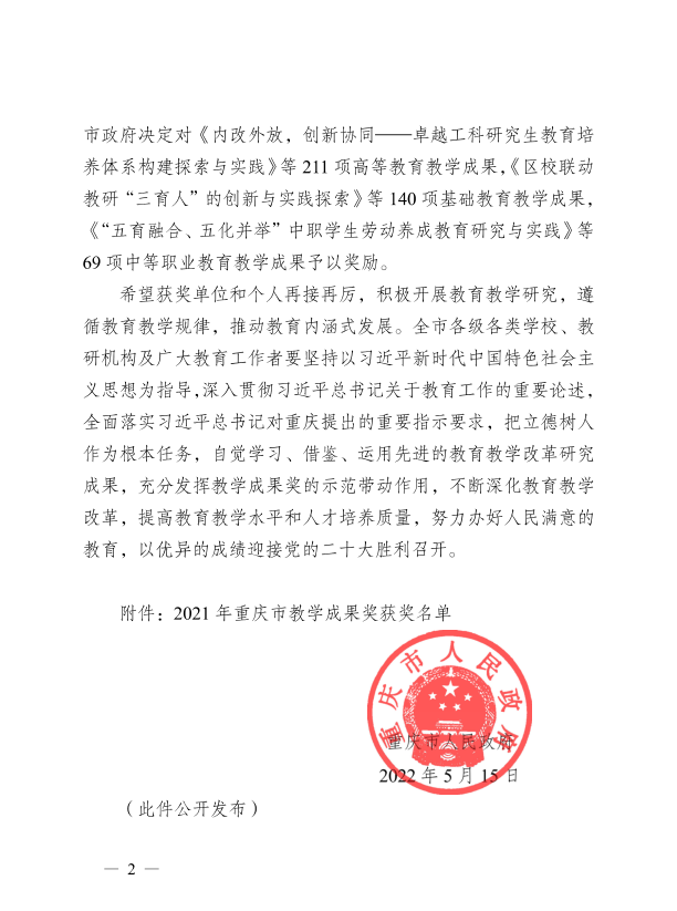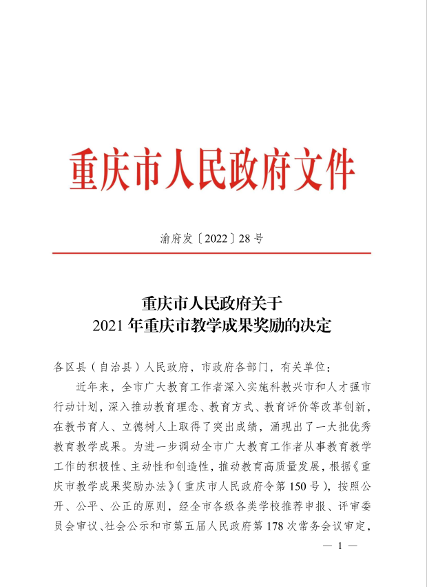 近期,在重庆市人社局公布的《2021年重庆市教学成果奖拟表彰成果公示》中我院共有2项教学成果荣获重庆市教学成果奖,其中一等奖1项,二等奖1项。