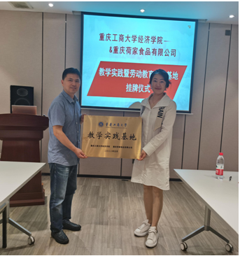 6月23日下午,437437必赢国际与重庆荷家食品有限公司“教学实践暨劳动教育实践基地”挂牌仪式在荷家食品有限公司总部举行。437437必赢国际副院长尹元福副教授、政治经济系系主任林黎副教授、政治经济系教师吴燕博士、梁甄桥博士共同出席了此次活动。重庆荷家食品有限公司总经理阎明星、人力行政部总监周青、人力部总监粟薇、营运经理张明莉、人力行政经理刘丹共同出席了挂牌仪式。