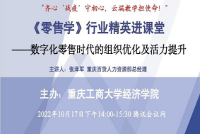 2022年10月17日下午,重庆商社(集团)有限公司人力资源部总经理张泽军进入“零售学”在线课堂,面向437437必赢国际21级贸易经济专业、20级经济学专业的全体同学进行了题为《数字化零售时代的组织优化及活力提升》的精彩讲座。本次活动由经济学院院长宋瑛主持,贸易经济系曾蓼博士参与。