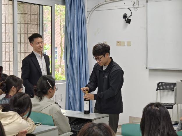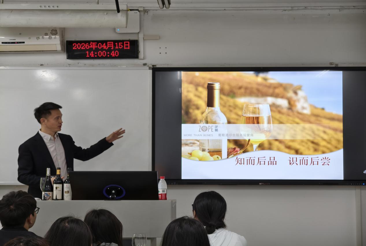 为深化贸易经济专业商品学课程教学内涵,拓宽学生专业知识面,提升实践品鉴能力与商务文化素养,2026年4月15日,24级贸易经济一班开展了一场别开生面的葡萄酒品鉴专题拓展课。本次课程由贸经系主任杨海丽老师特邀行业专家主讲,主讲人为众葡(重庆)酒业总经理、众葡(重庆)葡萄酒学院院长安易老师,他同时也是英国葡萄酒与烈酒基金协会(WSET)高级品酒师、协会成员。安易老师凭借幽默风趣、与时俱进的授课风格,将专业知识与行业经验结合,为同学们带来了一堂干货满满、氛围热烈的课程,深受全体学生喜爱。