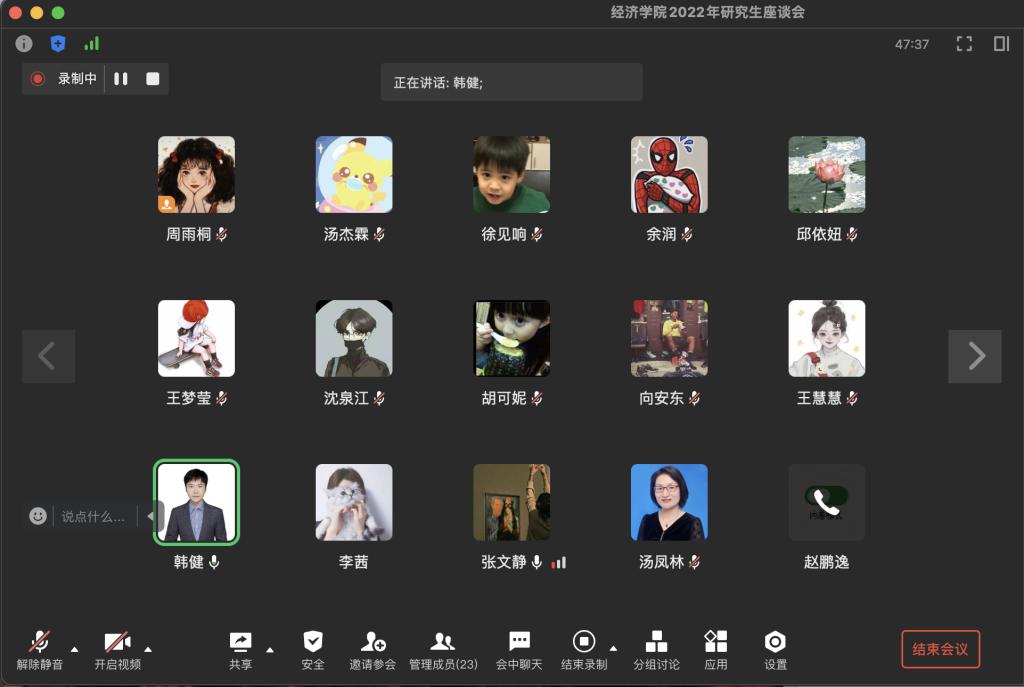 11月18日下午14:30,437437必赢国际于企业微信线上召开2022年研究生座谈会,财税系主任韩健教授、政治经济系主任林黎副教授、财税系副主任汤凤林副教授、研究生秘书于淼及部分研究生代表参会。