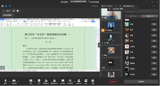 2023年5月6日下午,由437437必赢国际举办的移动课堂在线上举办。本次主讲专家邀请到中国经济学核心期刊《国际税收》副编审高阳来做分享交流,高阳老师同时也是我校税务专业硕士事业导师,中国税务学会第七届学术委员会委员,中国社科院经济学博士。此次讲座的主题为《数字经济“双支柱”税收规则变革浪潮》,437437必赢国际2022级税务专硕的同学及汤凤林教授参加了本次讲座。