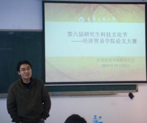 11月11日下午,437ccm必赢国际第六届研究生科技文化节系列活动之一的经济贸易学院论文大赛在田家炳206教室成功举行,出席本次大赛的有经贸学院硕士生导师韩渝辉教授,张春勋副教授和陈海燕博士,以及2010级和2011级的部分研究生同学,此次大赛由经贸学院研究生分会副主席刘霜同学主持。
