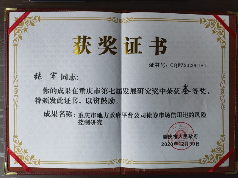 我院张军老师荣获重庆市第七届发展研究奖三等奖,成果名称为“重庆市地方政府平台公司债券市场信用违约风险控制研究”。