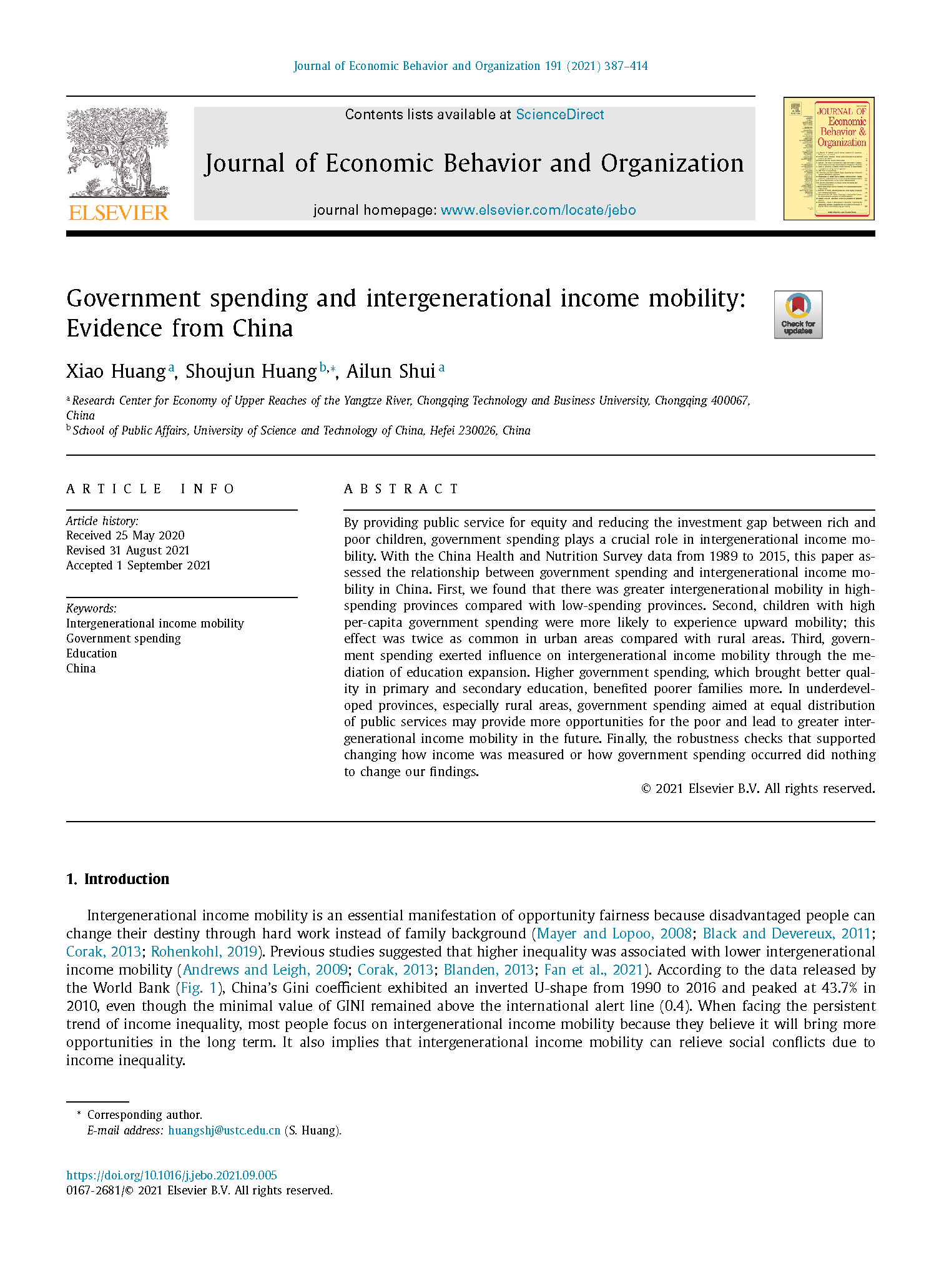 437437必赢国际副院长黄潇教授在行为经济学领域顶尖学术期刊《Journal of Economic Behavior and Organization》发表论文《Government spending and intergenerational income mobility:Evidence from China》,这也是我校教师首次在该期刊上发表学术论文。论文探讨了政府支出对代际收入流动的影响。通过提供均等的公共服务以及缩减人力资本投资的代际差异,政府支出对代际收入流动有着重要作用。论文研究发现,政府支出水平越高的地区通常代际收入流动性也相对更大,并且这些地区的向上流动概率更高。对欠发达地区而言(特别是欠发达的农村地区),政府在公共服务均等化方面的支出,更能够给经济困难群体创造更大的代际流动可能