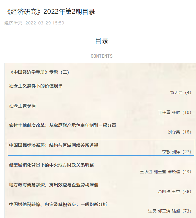 李敬教授在经济学权威期刊《经济研究》上发表学术论文