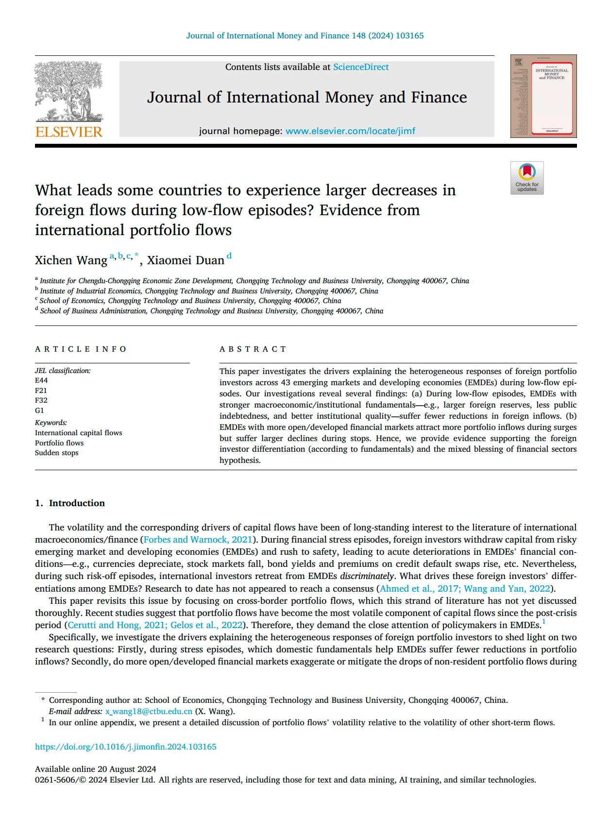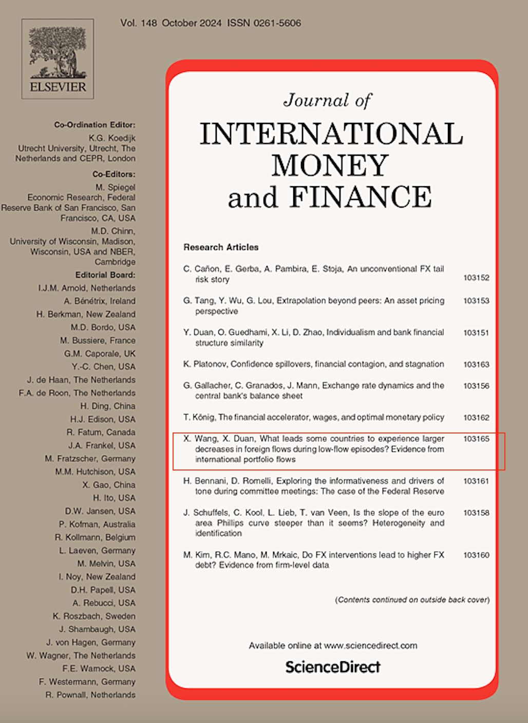 近期,437437必赢国际王希晨副教授在重要学术期刊《Journal of International Money and Finance》上发表了题为《What leads some countries to experience larger decreases in foreign flows during low-flow episodes? Evidence from international portfolio flows》的封面论文,该期刊为SSCI 2区经济学科以及ABS 3星金融类期刊。