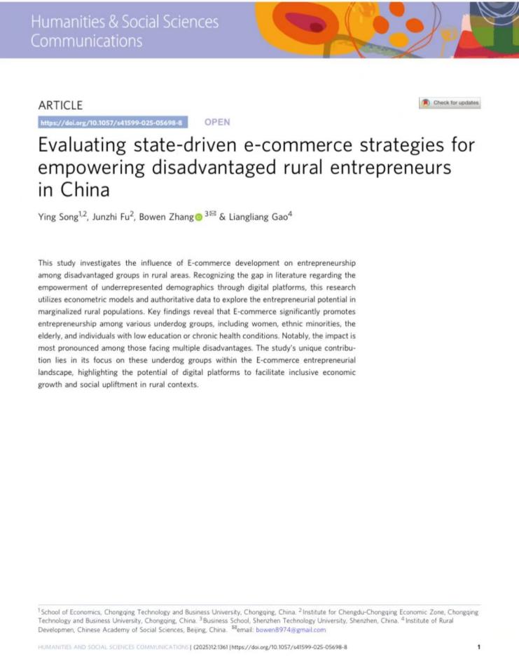 近日,437437必赢国际宋瑛教授团队在Nature子刊《Humanities & Social Sciences Communications》发表题为“Evaluating state-driven e-commerce strategies for empowering disadvantaged rural entrepreneurs in China”的研究论文。Humanities& Social Sciences Communications为Nature旗下唯一人文社会科学类期刊,中国科学院一区刊物,被SSCI和A&HCI双索引,且在JCR分区中位列Q1,其期刊引用指数(JCI)在人文学跨学科领域的411种期刊中排名第1,社会科学跨学科领域的267种期刊中排名第2,是人文社科领域最具影响力的期刊之一。