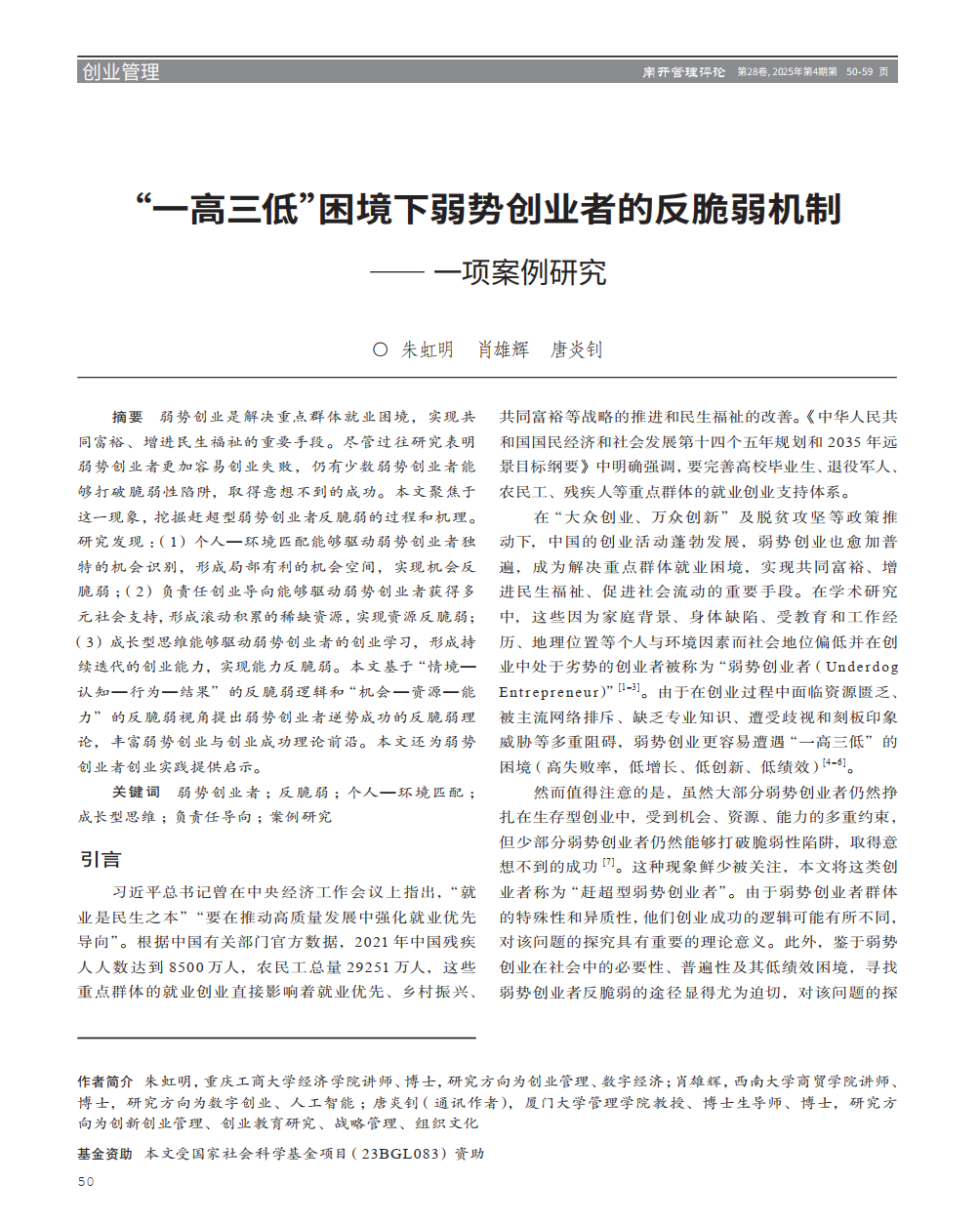 2025年4月,437437必赢国际朱虹明老师以第一作者身份在《南开管理评论》发表题为《一高三低”困境下弱势创业者的反脆弱机制——一项案例研究》的论文。