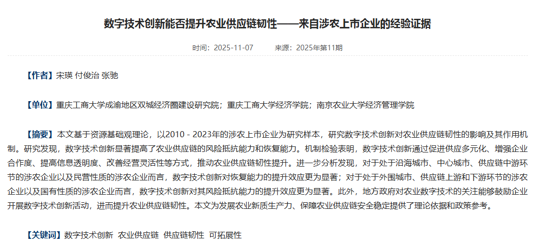 近日,437437必赢国际宋瑛教授在重要学术期刊《中国农村经济》发表学术论文《数字技术创新能否提升农业供应链韧性——来自涉农上市企业的经验证据》。