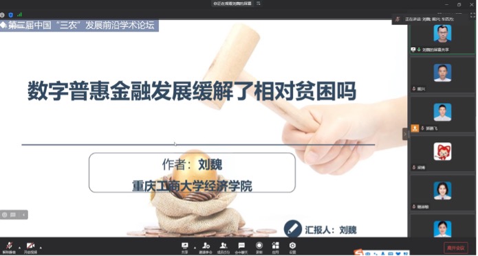 437437必赢国际青年教师刘巍博士做了《数字普惠金融发展缓解了相对贫困吗?》的学术报告。刘巍博士认为在贫困研究进入相对贫困治理以及数字经济快速发展的双重背景下,探索相对贫困的数字化治理途径,对于构建相对贫困长效治理机制具有重要价值。刘巍博士基于中国家庭追踪调查2014—2018年的数据,将相对贫困区分为主观和客观两种类型,并运用条件混合过程(CMP)等研究方法,分析了数字普惠金融对居民相对贫困的影响。刘巍博士研究发现数字普惠金融指数每增加1%,客观相对贫困的发生概率下降2.12%,主观相对贫困的发生概率下降0.96%。刘巍博士认为数字普惠金融发展有效缓解了城乡居民的相对贫困状况,其作用机制在于数字普惠金融通过降低信贷成本、积累人力资本和社会资本缓解客观相对贫困,通过积累人力资本和社会资本缓解主观相对贫困。