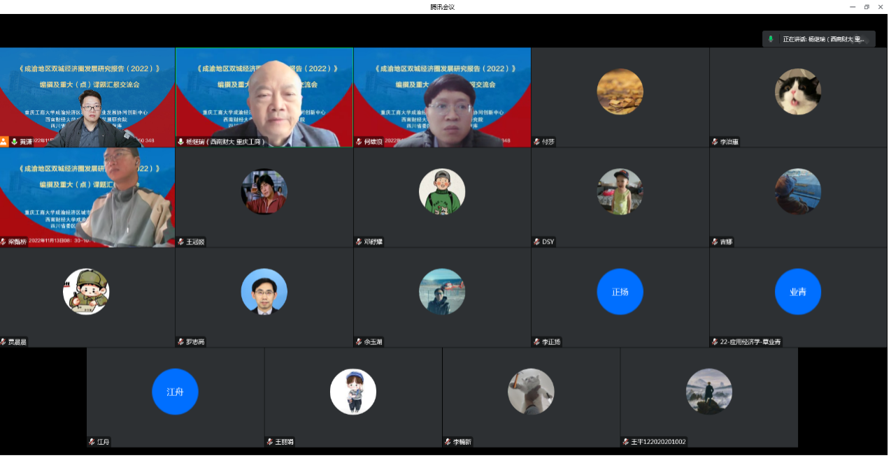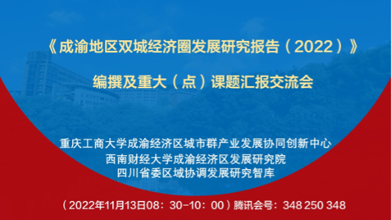 2022年11月13日,《成渝地区双城经济圈发展研究报告(2022)》编撰及重大(点)课题汇报交流会以在线会议方式举行。《成渝地区双城经济圈发展研究报告》是我校成渝经济区城市群产业发展协同创新中心推出的标志性咨询成果,该报告以皮书形式按年出版,旨在对成渝地区双城经济圈的发展进行多方位的评估,并提出推进成渝地区双城经济圈高质量发展的政策建议。2021年度的《成渝地区双城经济圈发展研究报告》已由经济管理出版社正式出版。