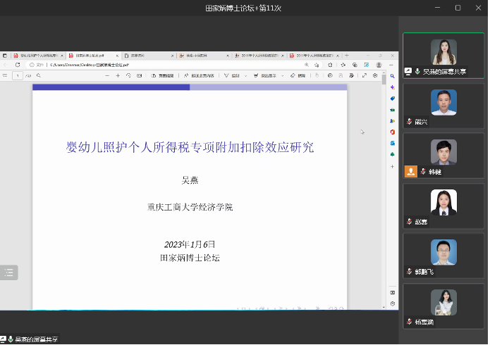 2023年1月6日上午,437437必赢国际、长江上游经济研究中心于企业微信线上举办了第十一次“田家炳博士论坛”,437437必赢国际财税系系主任韩健教授、近年新进青年博士教师和长江上游经济研究中心的博士研究生参加了本次论坛。本期论坛邀请青年教师吴燕博士、杨寓涵博士作学术报告,论坛由韩健教授主持,郭鹏飞博士、熊兴博士筹备。