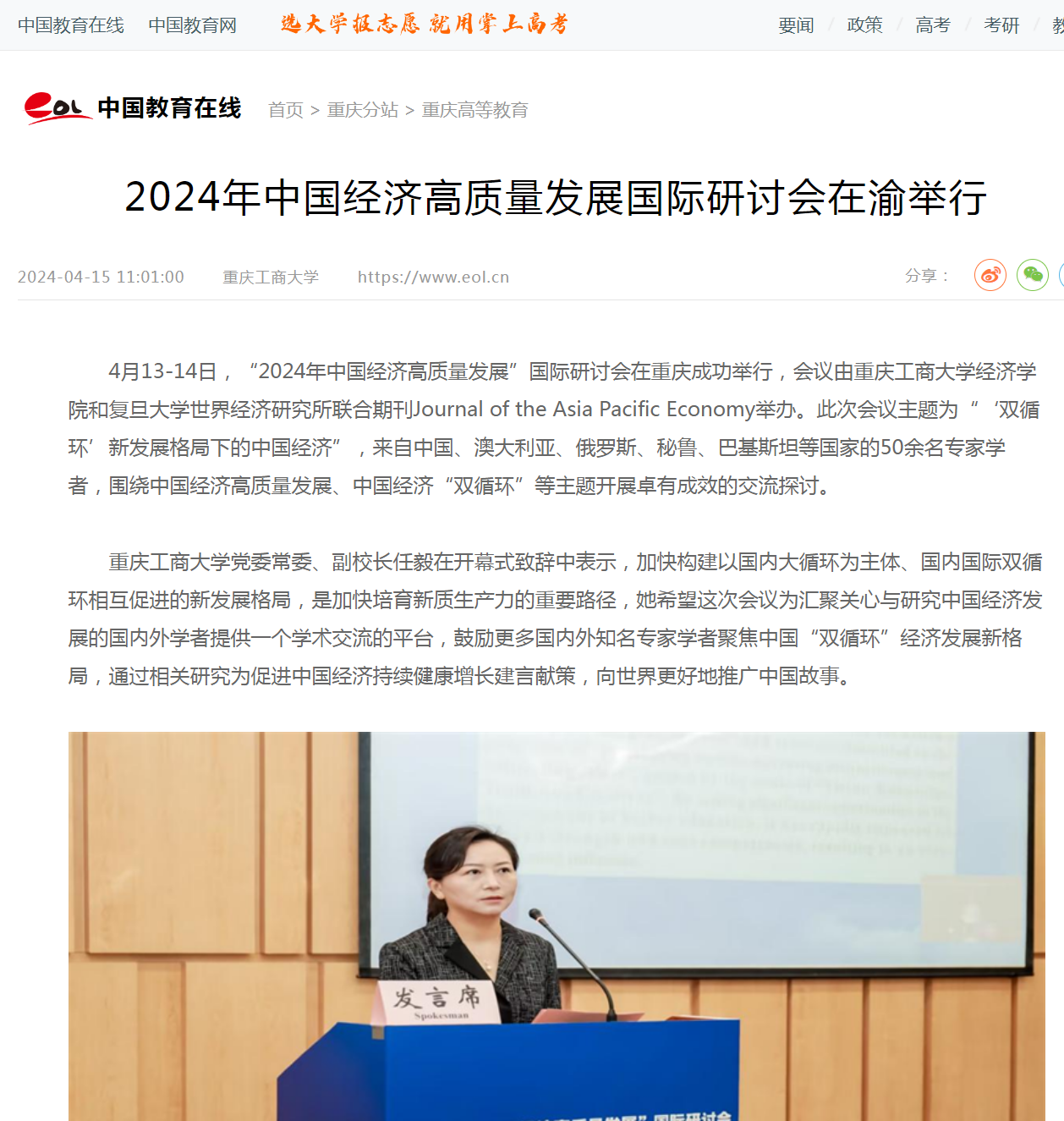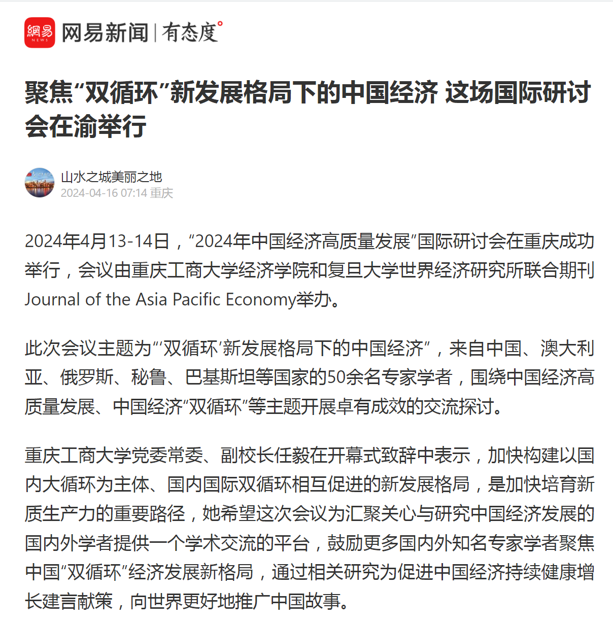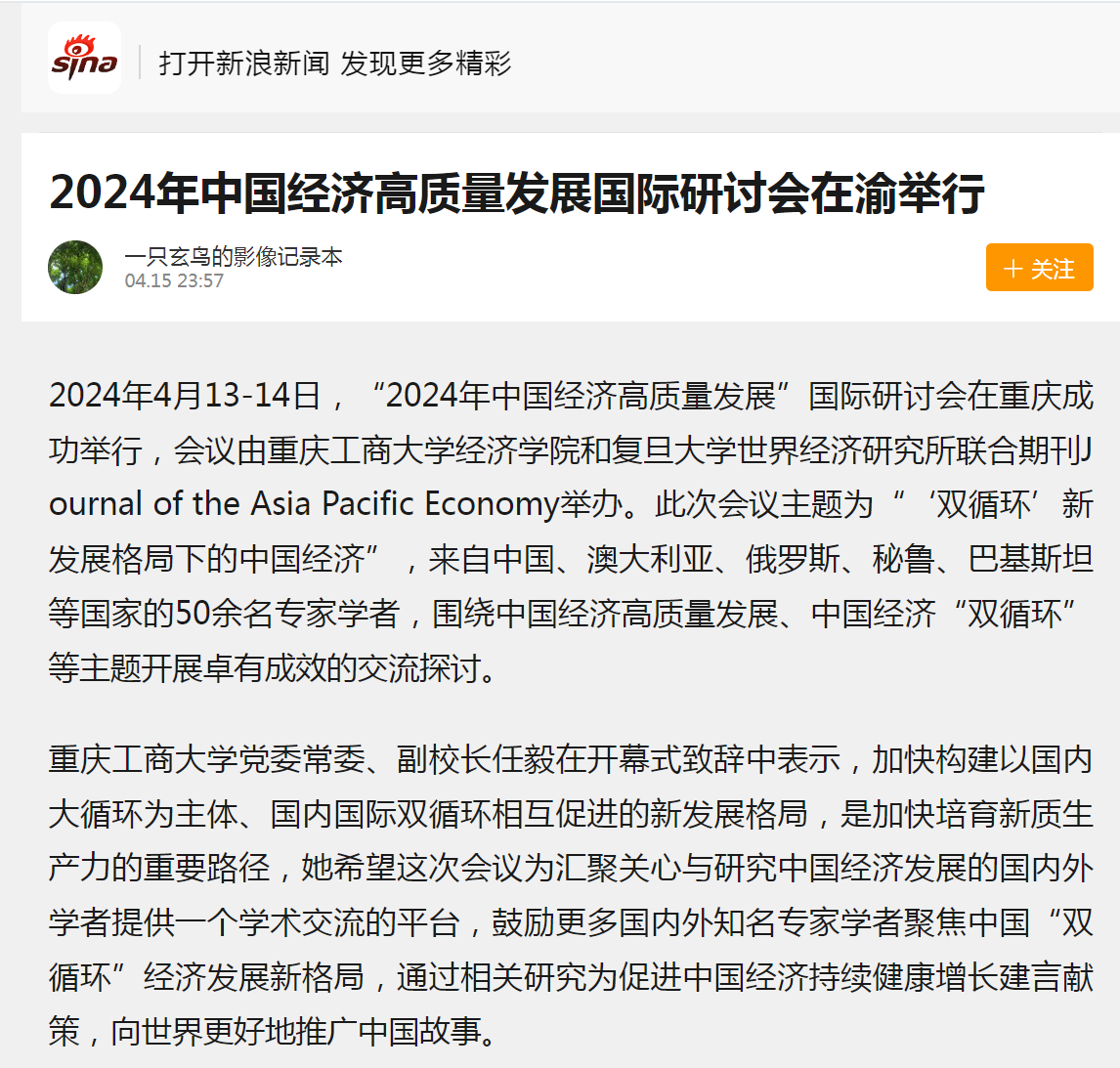 2024年4月13-14日,第三届中国经济高质量发展国际研讨会在在重庆成功举行,会议由437437必赢国际和复旦大学世界经济研究所联合期刊Journal of the Asia Pacific Economy举办。此次会议主题为“‘双循环’新发展格局下的中国经济”,来自中国、澳大利亚、俄罗斯、秘鲁、巴基斯坦等国家的50余名专家学者,围绕中国经济高质量发展、中国经济“双循环”等主题开展卓有成效的交流探讨。