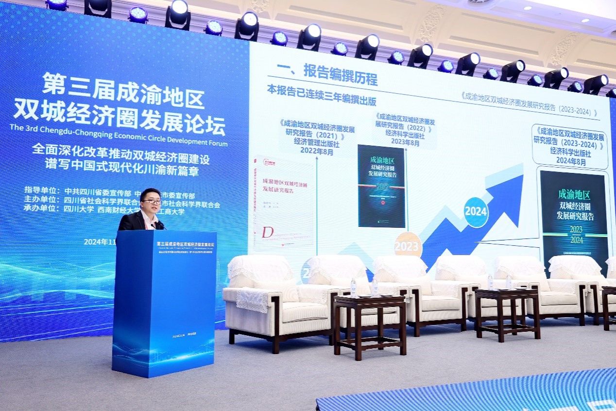 首先,我校成渝地区双城经济圈建设研究院副院长黄潇发布了由我校、西南财经大学、成都大学联合牵头编撰的《成渝地区双城经济圈发展研究报告(2023-2024)》,这也是该系列报告连续三年出版。四川大学副院长龚勤林发布了《川渝高竹新区共建成效及优化建议》研究报告。
