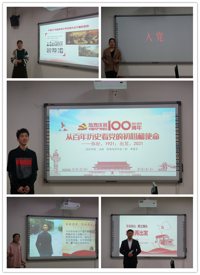 来自学院18.19两个年级的选手们分别以“以党为纲,奋斗精神”、“从百年历史看党的初心和使命”、“一群人、一百年、一件事、一辈子”、“不忘初心,牢记使命”以及“红船”为题,带领现场的听众重新走进革命年代,谱写革命精神。选手们都谈到中国共产党的一百年,是开创历史、开辟未来的一百年,是解放思想、实事求是的一百年,是不忘初心、牢记使命的一百年,当代青年应借述百年党史,宣吾辈之朝气。从革命先烈李大钊、汪竹筠到科技开发者华罗庚、茅以升再到当代奋勇向前的抗疫人员,党的精神生生不息、流传至今,开辟出一条又一条属于中国的特色道路,引领着一代又一代的中国人民继续向前行进,呼吁着当代青年不忘党和国家的殷切希望、勇挑重担、奋勇前行!