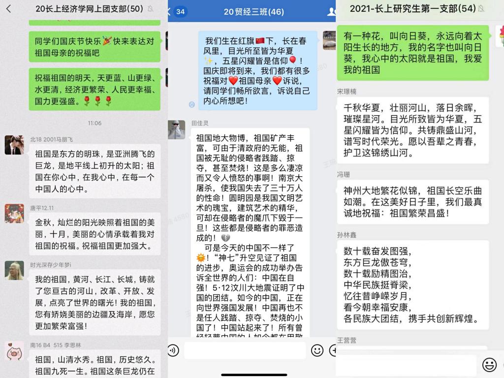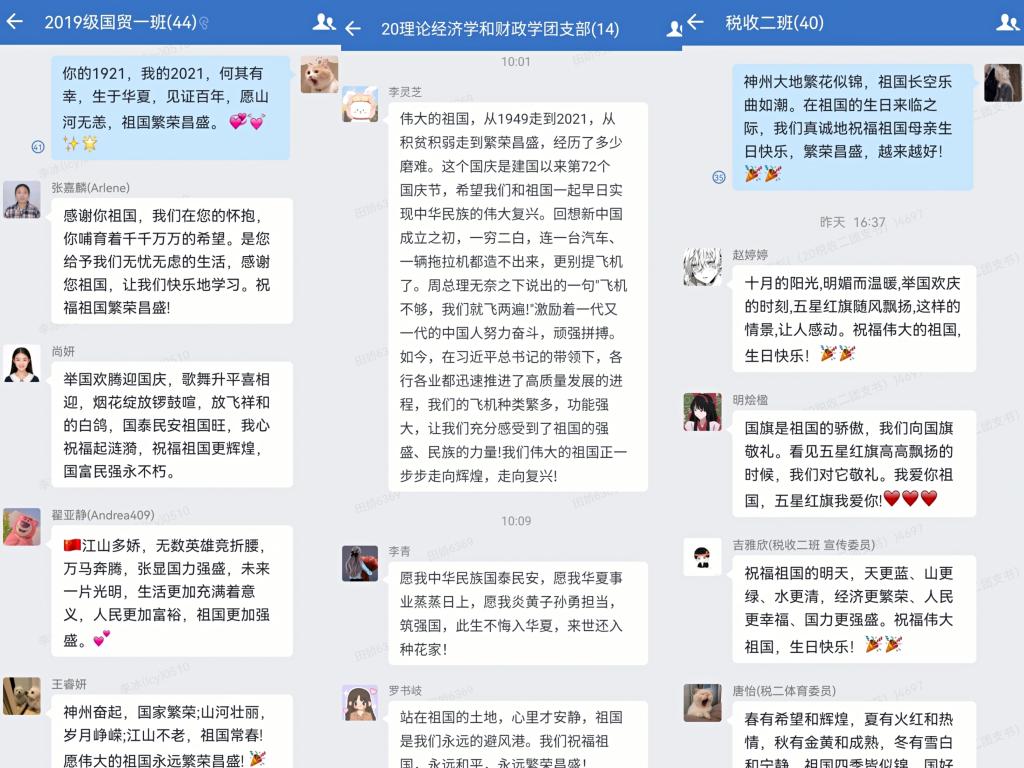 7月1日,习近平总书记在天安门广场的重要讲话中寄语青年,他提到“未来属于青年,希望寄予青年。新时代的中国青年要以实现中华民族伟大复兴为己任,增强做中国人的志气、骨气、底气,不负时代,不负韶华,不负党和人民的殷切期望!”在祖国生日之际,全体经济学子深刻学习习近平总书记七一重要讲话精神,用自己的方式表达对祖国的祝愿,同学们挥动着手中的小国旗,以视频的形式为祖国送上真挚的祝福;同学们在国旗下朗诵《我的祖国》,歌颂出同学们对祖国的无限热爱之情;同学们在班级群通过“祖国,我想对您说”传递祝福,一句句祝福表达了经济学子对祖国的热爱,立志用实际行动践行“请党放心,强国有我”的青春誓言的决心。
